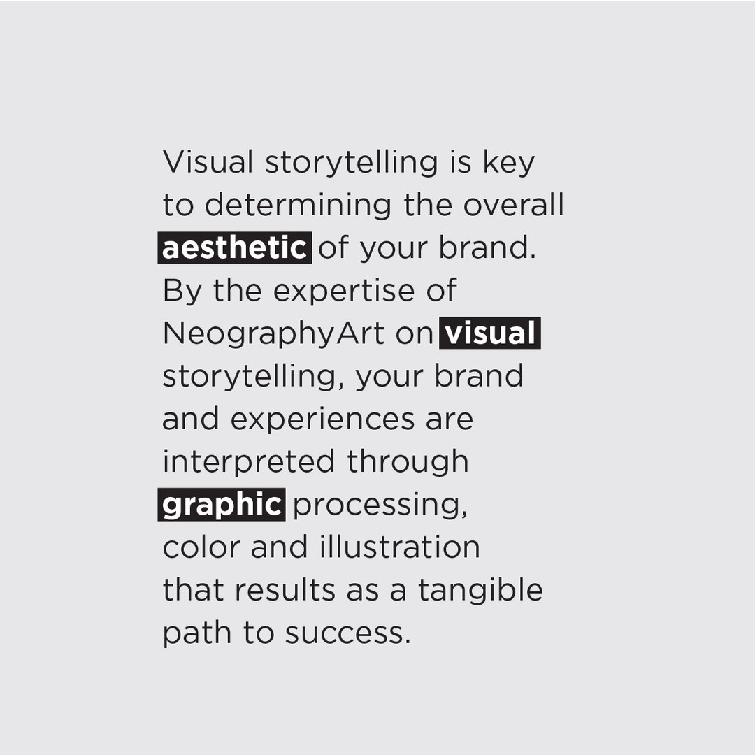 Our ultimate goal is to create a unique design by identifying the needs, direction, desires and goals of each brand. Visual storytelling is key to determining the overall aesthetic of the brand and also sets the tone and feel of any digital, print or live experience. NeographyArt helps bring brands and experiences to life through graphics, color and photography.